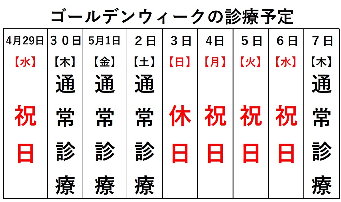 GWはカレンダー通りで診療をしております。